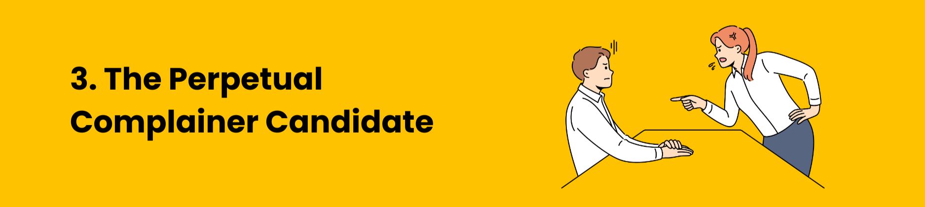 Look for candidates who have a lot to complain about their past jobs or those who keep referring to the things that went wrong in their past jobs. A negative attitude during the interview indicates a lack of accountability for their own mistakes and future issues with the team.